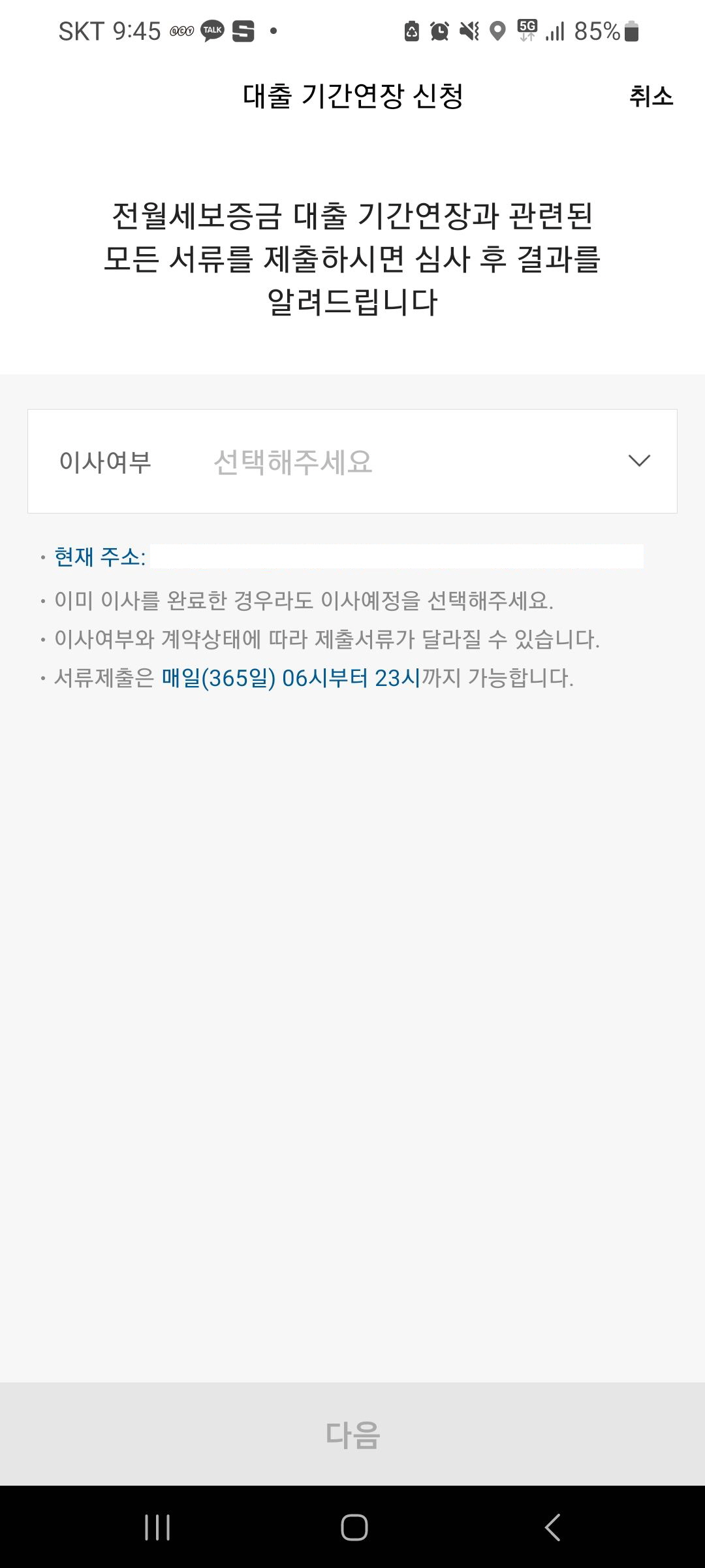 본 글은 제목에서와 같이 전세 연장을 집주인과 구두계약으로 진행하여 전월세 보증금 대출 연장을 하는 것 이기에 당연히 이사는 안하는 것으로 선택 하여야 한다.